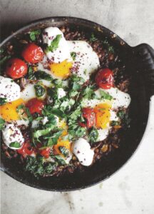 Deze combinatie is fusion food uit Jeruzalem op zijn best. Hij bevat traditionele, zuiver Palestijnse elementen en ingrediënten die karakteristiek zijn voor verschillende joodse keukens, die allemaal op een niet-traditionele manier worden samengevoegd. Het is geïnspireerd op Hamshukah, een vrij jonge klassieker en signatuurgerecht van Machneyuda, het restaurant op de markt dat sinds kort de meest vernieuwende gerechten van de stad serveert.